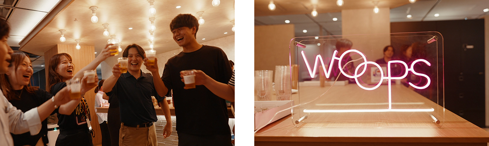 さらに、Design dialogueと同日の終業後、「BAR WOOPS」を開催しました🍹 皆さんの息抜きの場となってほしい!少しでも雰囲気を楽しんでほしい! という思いから、ドリンクやフード、オリジナルネオンサインまで、WOOPS一同気合を入れて準備しました✨ 自由参加としていましたが、想像以上の大盛況! たまには職場でお酒を片手に談笑するのも悪くないですよね😊 これからも定期的に開催する予定です👍 |